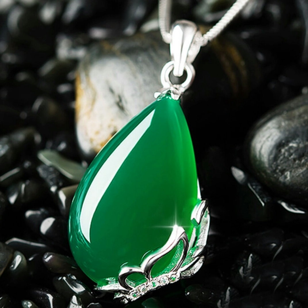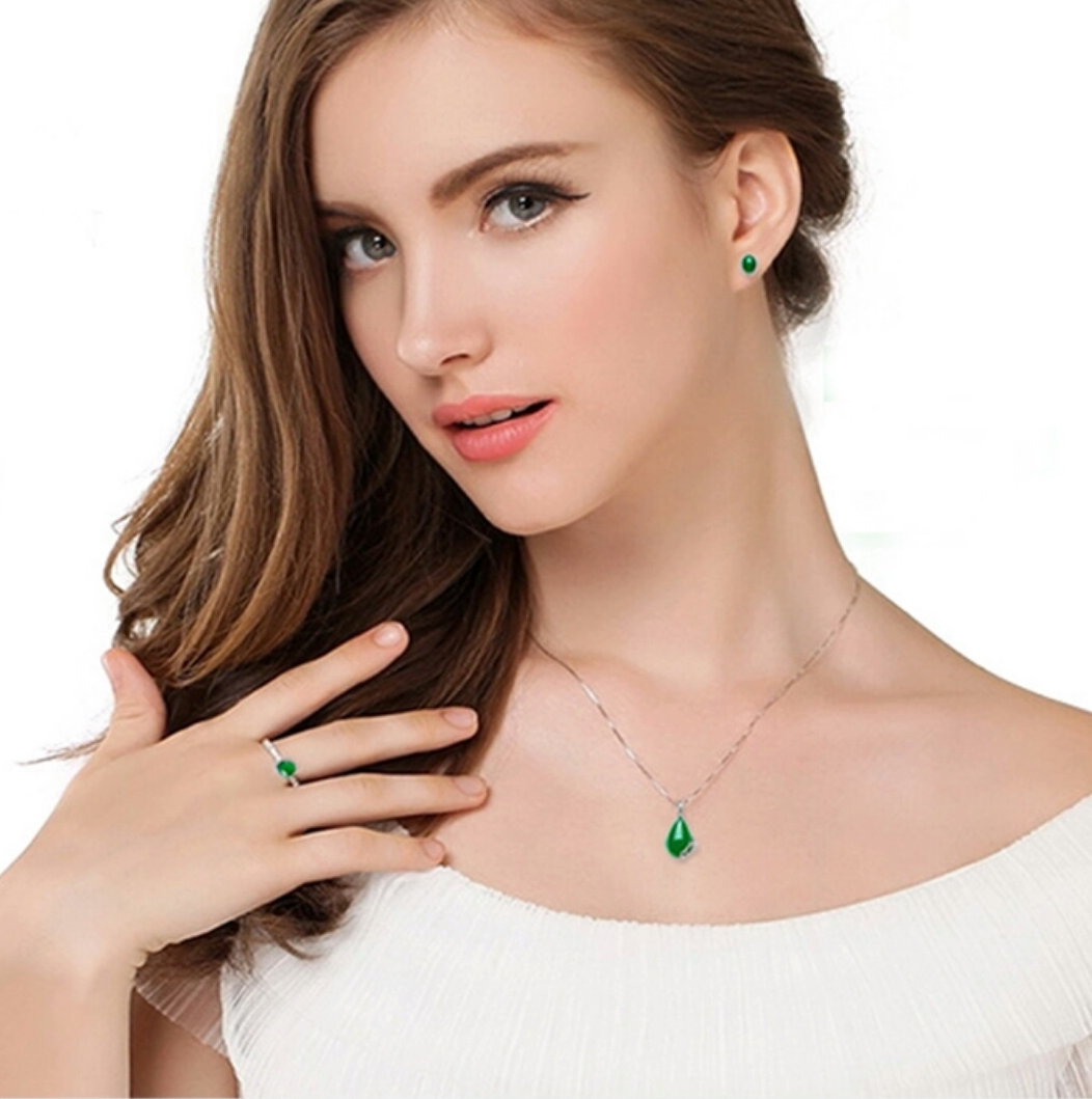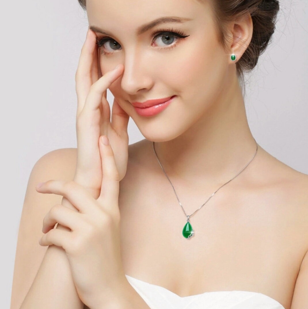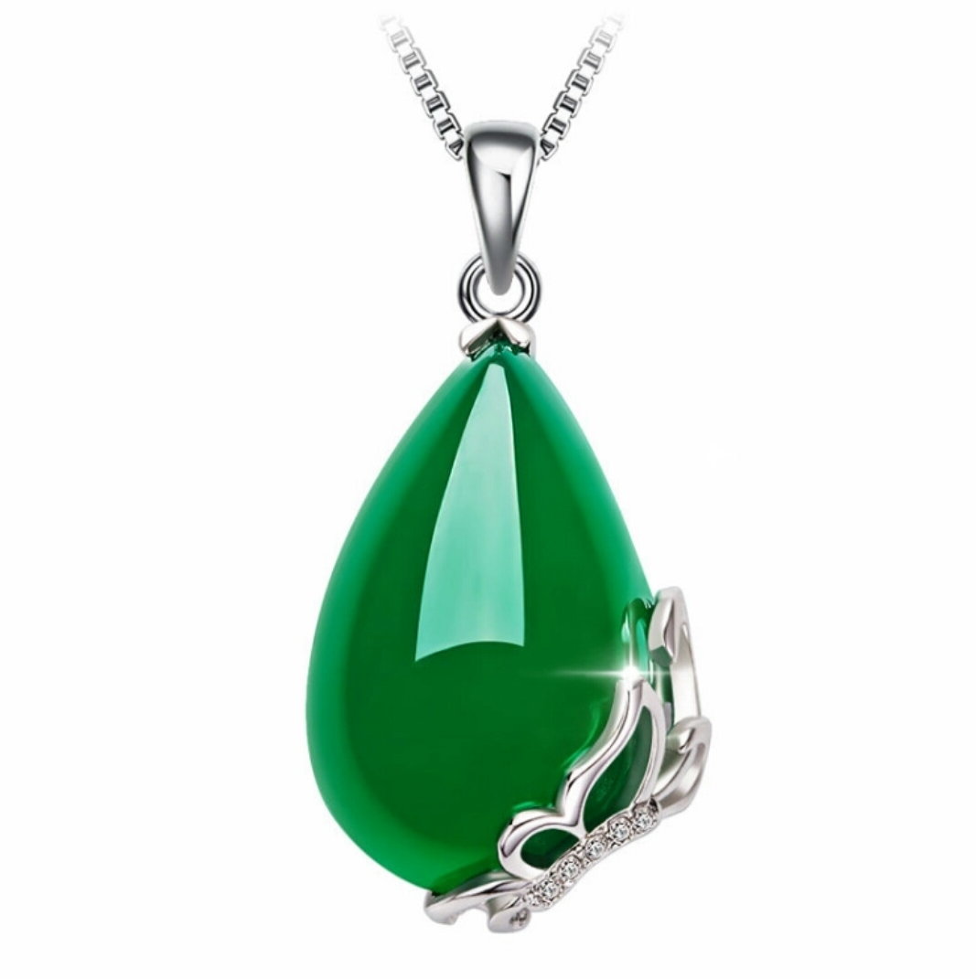 Stunning Natural Drop Emerald Jade Green Silver Bridal Necklace Bridesmaids Charm Crystal Pendant
